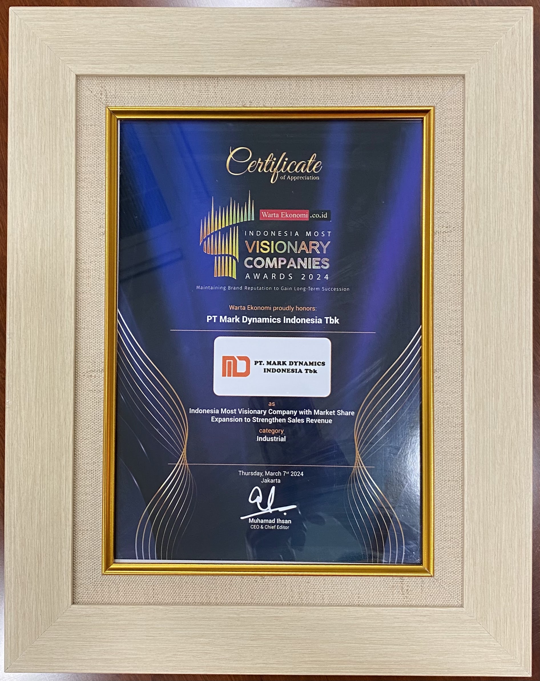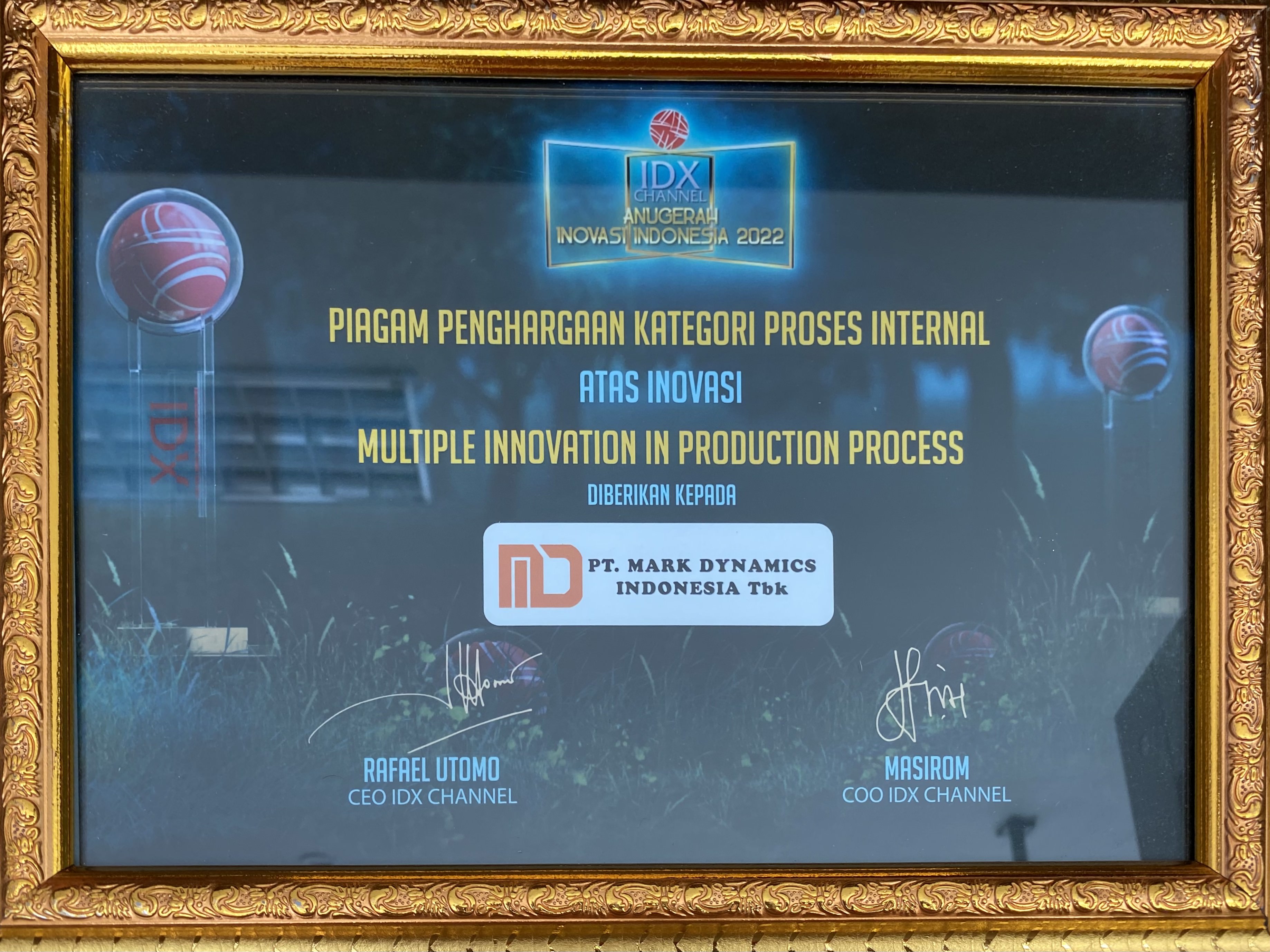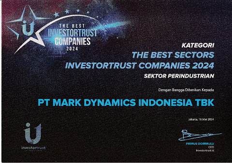 Perseroan terpilih dengan kategori Proses Internal atas Inovasi Pengolahan Bahan Baku Sarung Tanganoleh IDX Channel Innovation Award 2020. Selain itu, Bapak Ridwan selaku CEO PT. Mark Dynamics Indonesia Tbk juga berhasil menyambet penghargaan dengan kategori Rising Star CEO.
