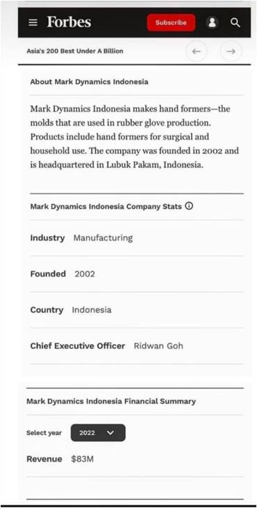 Perseroan mendapatkan sertifikat atas keanggotaan asosiasi (MARGMA) Malaysia Rubber Glove Manufacture Association.