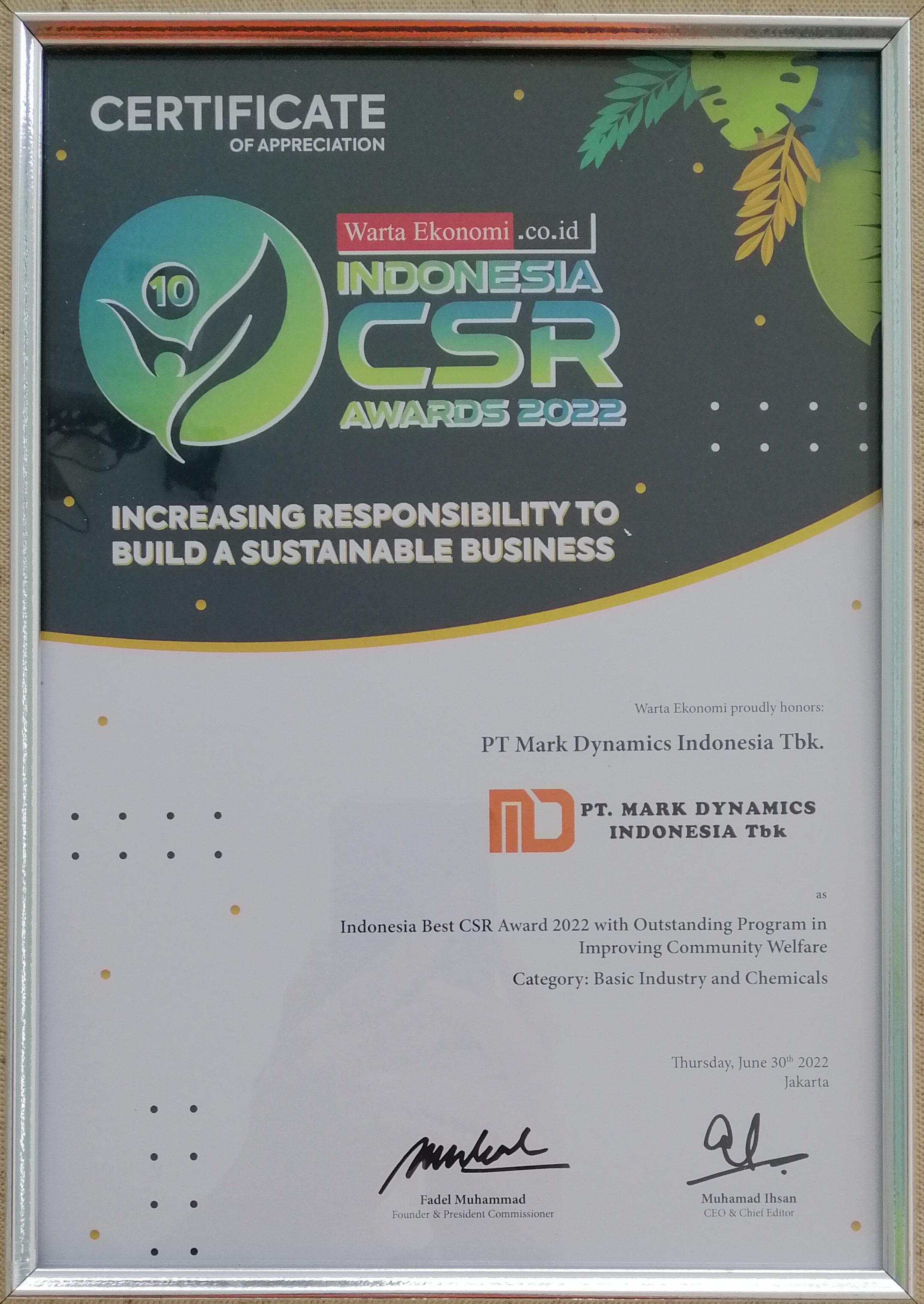 Perseroan terpilih dengan kategori The Most Promising for Basic and Chemical Industry dan penghargaan kepada Bapak Ridwan terpilih sebagai Rising Star CEO dalam ajang Bisnis Indonesia Award 2020.